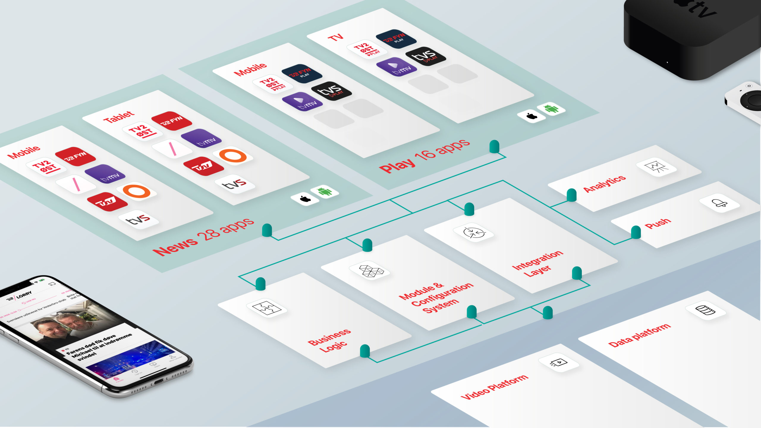 For yderligere at imødekomme det stigende forbrugerbehov for streaming, men på en kosteffektiv måde, er der desuden via den samme infrastruktur, modulmotor, datamodel og integrationslag skabt et streaming-univers, som leverer on-demand udsendelser til smartphonen samt i stuen via Apple TV og Android TV. I alt drives der 16 apps her.